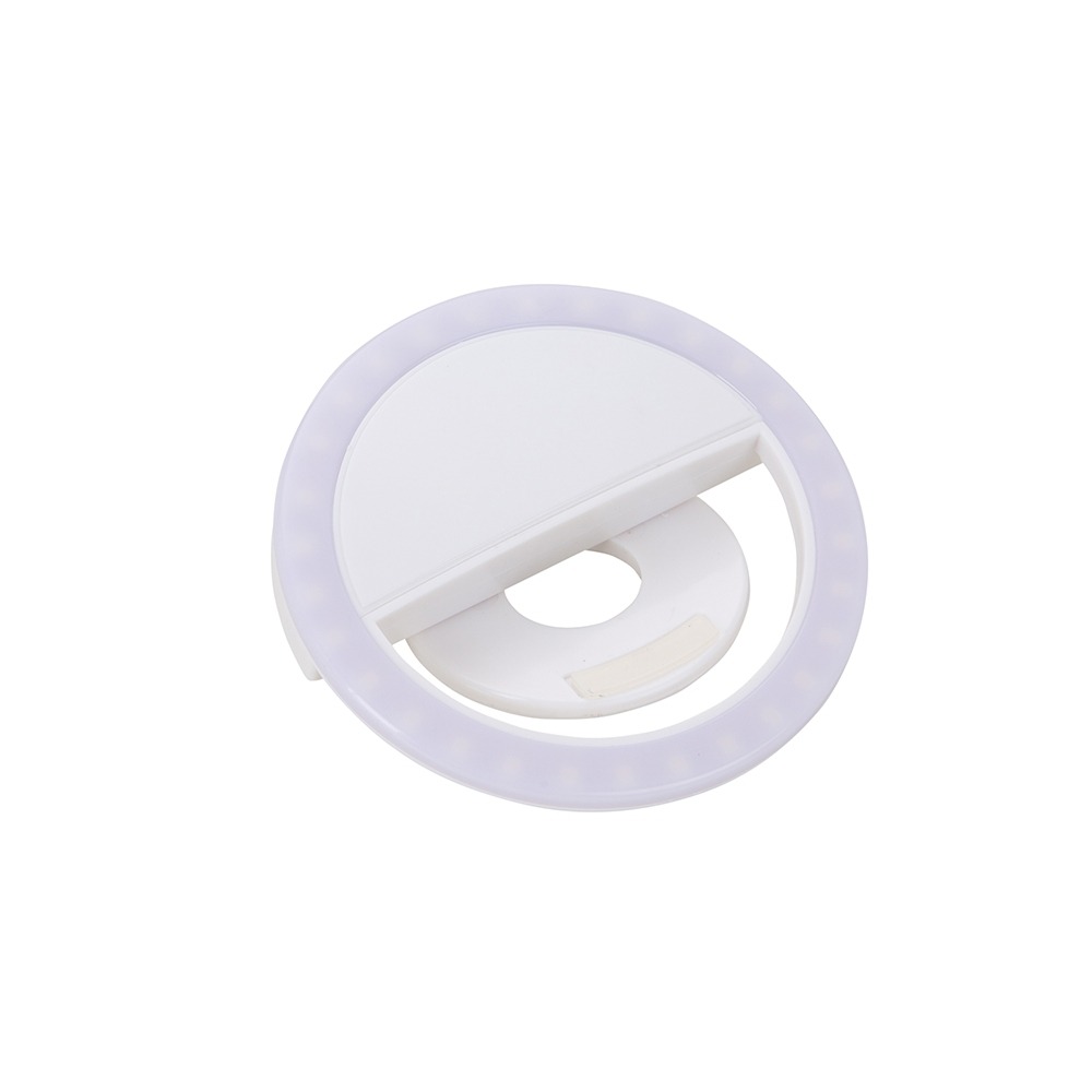 Anel de iluminação para celular, utilizado para fotos em formato selfie. “Ring light” plástico no formato “presilha” para encaixe, possui três estágios de iluminação acionados pelo botão superior. Acompanha cabo USB para carregamento.
