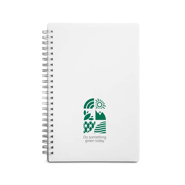Caderno A5 em PP com tratamento antibacteriano, segundo a certificação ISO22196. Contém 80 folhas pautadas em papel reciclado branco.