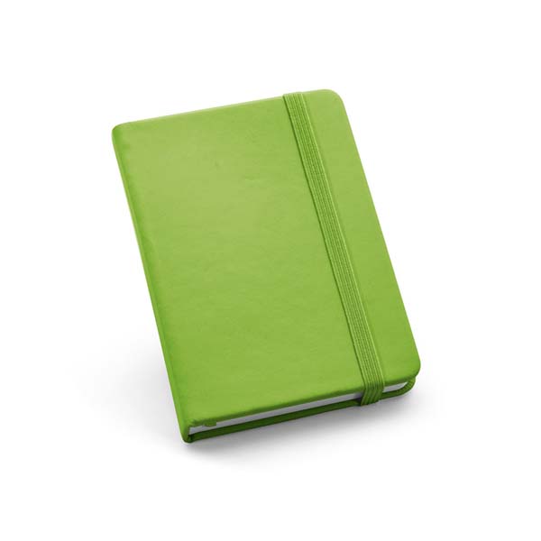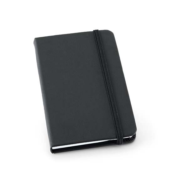 Caderno de bolso com 80 folhas lisas, capa dura em c. sintético, fita separadora e elástico.