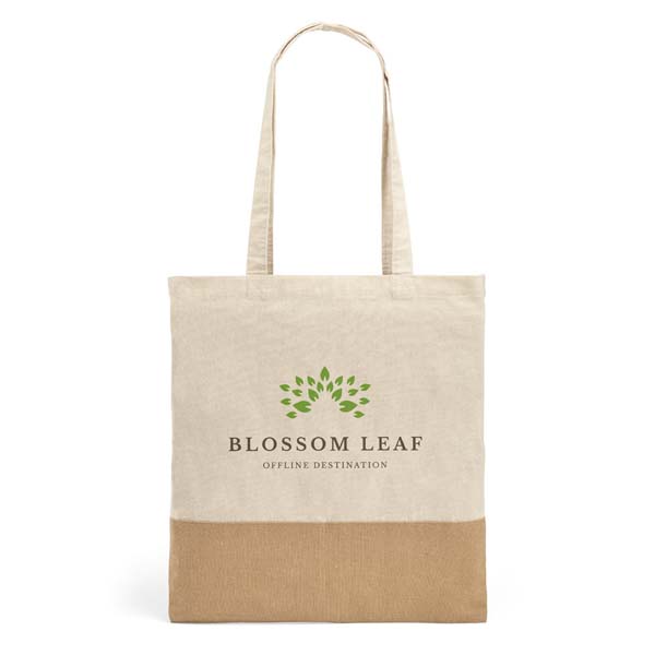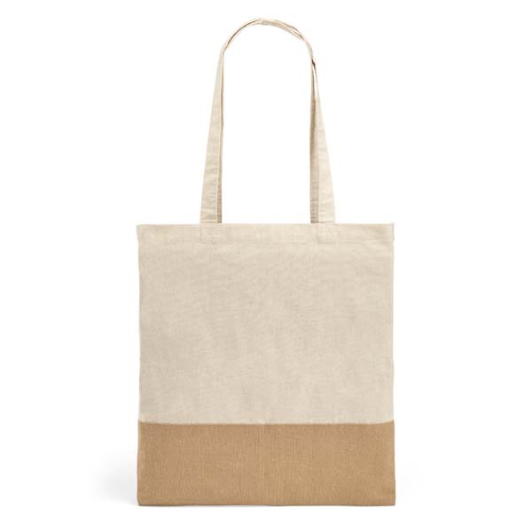Sacola 100% algodão (160 g/m²) com detalhe em imitação de juta e alças de 65 cm.