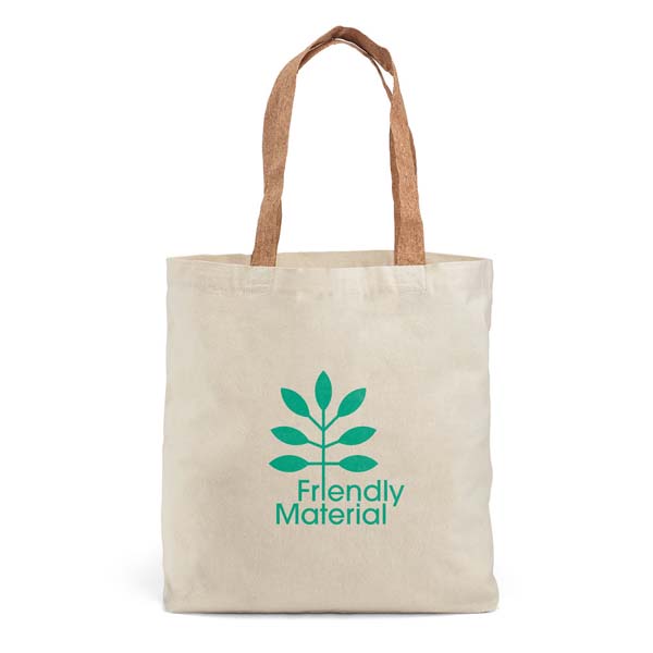 Sacola 100% algodão (180 g/m²) com alças de 60 cm em cortiça e com bolso interior.
